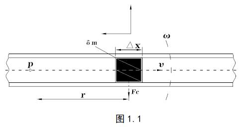 當(dāng)一個位于以P為固定點(旋轉(zhuǎn)中心)作旋轉(zhuǎn)運動的管子內(nèi)的質(zhì)點做朝向旋轉(zhuǎn)中心或離向旋轉(zhuǎn)中心的運動時,將產(chǎn)生一慣性力,原理如圖1.1: 圖中質(zhì)量為δm的質(zhì)點以勻速υ在管道內(nèi)向右運動,而管道圍繞固定點P以角速度ω旋轉(zhuǎn)。此時這個質(zhì)點將獲得兩個加速度分量: