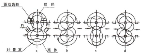 當被測液體流經(jīng)計量室時,在流量計的進出口形成壓差,腰輪在此壓差的推動下旋轉(zhuǎn).同時通過固定在腰輪軸上的一對驅(qū)動齒輪,使兩個腰輪保持連續(xù)旋轉(zhuǎn)。隨著腰輪的轉(zhuǎn)動。液體經(jīng)由計量室被不斷排出流量計。每對流過的液體量是計量室容積的四倍,通過密封聯(lián)軸器、減速機構(gòu)。將旋轉(zhuǎn)次數(shù)減速后傳遞到計數(shù)器,計數(shù)器即指示液體瞬時流量和累積流量.