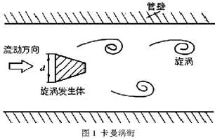 在流體中設置旋渦發(fā)生體(阻流體),從旋渦發(fā)生體兩側(cè)交替地產(chǎn)生有規(guī)則的旋渦,這種旋渦稱為卡曼渦街(見圖1),旋渦列在旋渦發(fā)生體下游非對稱地排列。根據(jù)卡曼渦街原理,有如下關系式: