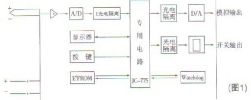 智能流量積算儀是由測量回路、數(shù)字面板表、調(diào)節(jié)器和電源四個部分組成。穩(wěn)壓電源將220V供電轉(zhuǎn)換成穩(wěn)定的直流電壓作為其它部分電源。測量回路將流量變送器送來的信號(電壓、電流等)經(jīng)過處理后,變?yōu)殡妷盒盘。該信號?jīng)過A/D轉(zhuǎn)換后輸送到JC-775專用中央處理器進行處理后,不僅要送到數(shù)字面板表,而且也要送到調(diào)節(jié)器,與設定值比較后按調(diào)節(jié)規(guī)律輸出控制或報警信號。工作原理框(圖1)