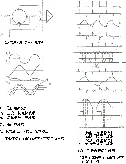 工頻干擾噪聲是由電磁流量傳感器勵磁繞組和流體、電極、放大器輸入回路的電磁耦合,另外分體式電磁流量計工作現(xiàn)場的工頻共模干擾,其三供電電源引入的工頻串模干擾等,其產(chǎn)生的物理機(jī)理均是電磁感應(yīng)原理。首先就電磁流量傳感器勵磁繞組和流體、電極、放大器輸入回路的電磁耦合產(chǎn)生的工頻干擾對分體式電磁流量計工作影響最大,而且在不同的勵磁技術(shù)下其表現(xiàn)的形態(tài)、特性不同,因而采取抗干擾措施也不同,如圖1所示在各種勵磁技術(shù)。