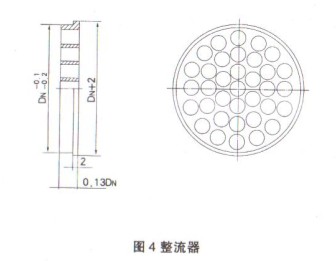 3、 整流器的安裝:場地限制,直管段無法滿足,應(yīng)安裝整流器,見圖4,是一種非均勻分布多孔整流器,結(jié)構(gòu)簡單,成本低,安裝方便,阻力損失小,安裝見圖5。
