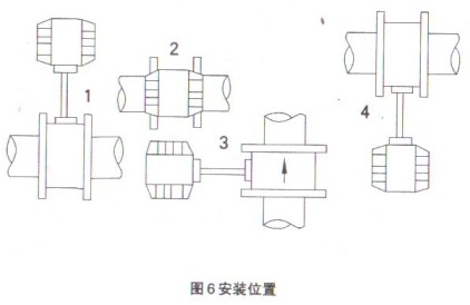 4、 安裝條件:渦街流量計(jì)應(yīng)遠(yuǎn)離振動源,有振動時在前后直管段2DN處加支架用橡皮減振。傳感器通徑圓應(yīng)與直管段內(nèi)徑圓保持同心。法蘭焊接時,密封夾緊時,管內(nèi)不得有突出部分。流向應(yīng)與箭頭方向一致。(高溫時推薦2、3、4位置,常溫和低溫時推薦1位置,垂直管道時選3位置)見圖6