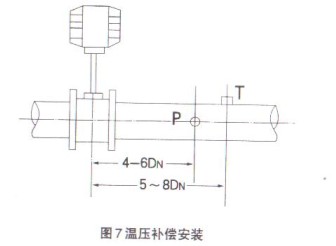 5、 溫度壓力補(bǔ)償安裝:P-壓力變送器,T-溫度傳感器,安裝在后直管段上,見圖7。