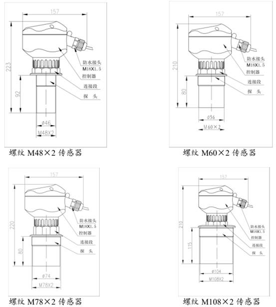 超聲波液位計(jì)可采用二線制、三線制或四線制技術(shù),供電回路和信號(hào)輸出回路獨(dú)立,當(dāng)采用直流24v供電時(shí),可使用一根3芯電纜線,供電負(fù)端和信號(hào)輸出負(fù)端共用一根芯線;當(dāng)采用交流220v供電時(shí),或者當(dāng)采用直流24v供電,要求供電回路與信號(hào)輸出回路完全隔離時(shí),應(yīng)使用一根4芯電纜線。直流或交流供電,具有4~20mADC,高低位開關(guān)量輸出。 超聲波液位計(jì)應(yīng)用: 1、測量流量、液位、低表壓、真空和比重 2、兩線制最大量程可達(dá)30m 3、四線制最大量程可達(dá)40m 4、最小分辨率1mm 5、LCD/LED大顯示屏 6、智能信號(hào)處理技術(shù) 7、配有高低位雙繼電器(僅四線制) 8、全塑料防腐外殼(防護(hù)等級(jí)lP67) 9、換能器結(jié)構(gòu)(小量程物位計(jì)法蘭安裝時(shí),對(duì)法蘭接管長度無要求) 10、簡單的按鍵設(shè)定參數(shù)(無需等待容器排空或加滿,無需附加的遙控器) 11、靈活的安裝方式(螺紋/法蘭、固定孔/支架) 螺紋尺寸:M48*2 M60*2 超聲波液位計(jì)技術(shù)參數(shù)