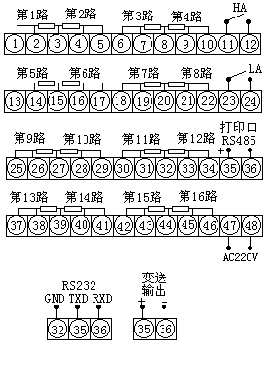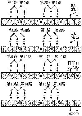 報警輸出: ⑴1-64通道統(tǒng)一上下限報警,繼電器輸出觸點(diǎn)容量 AC220V/3A